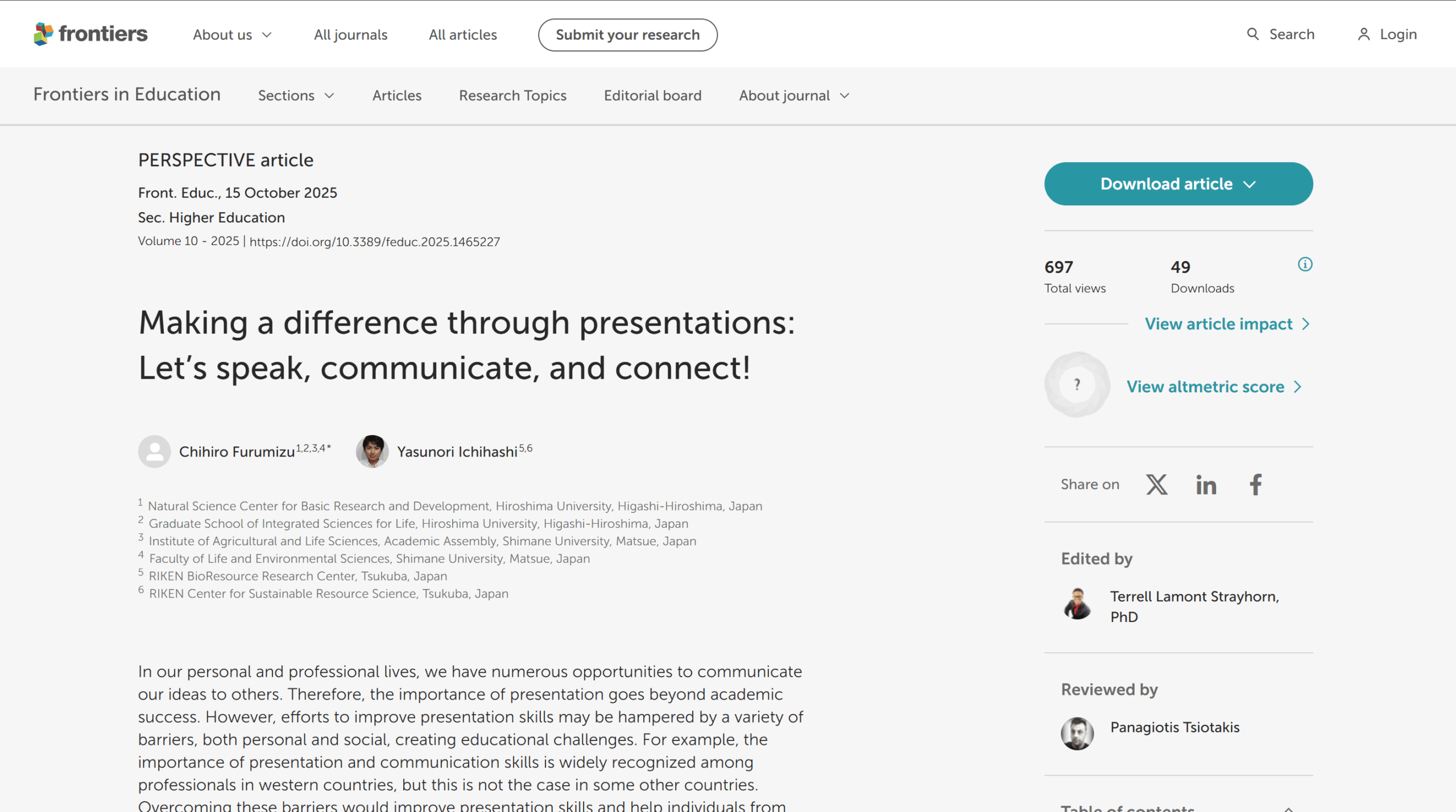 掲載されたのは、島根大学 生物資源科学部 古水千尋准教授と理化学研究所 市橋泰範チームディレクターによる英語論文『Making a difference through presentations: Let’s speak, communicate, and connect!(2025年10月15日公開)』。